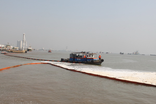 Dầu tràn được phao gom lại và hút lên xà lan bằng máy bơm chuyên dùng